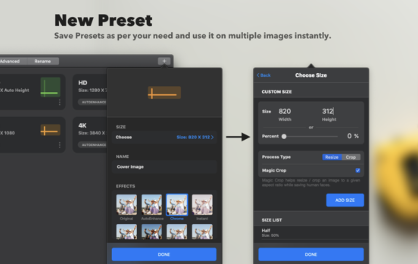从新手到高级,我们都照顾到每个用户。如果您对“宽度”和“高度”框中的数字不了解,不用担心,只需将图像拖放到任何预设和“完成”上即可。如果您需要高级控件,我们将为您准备一个单独的高级部分。