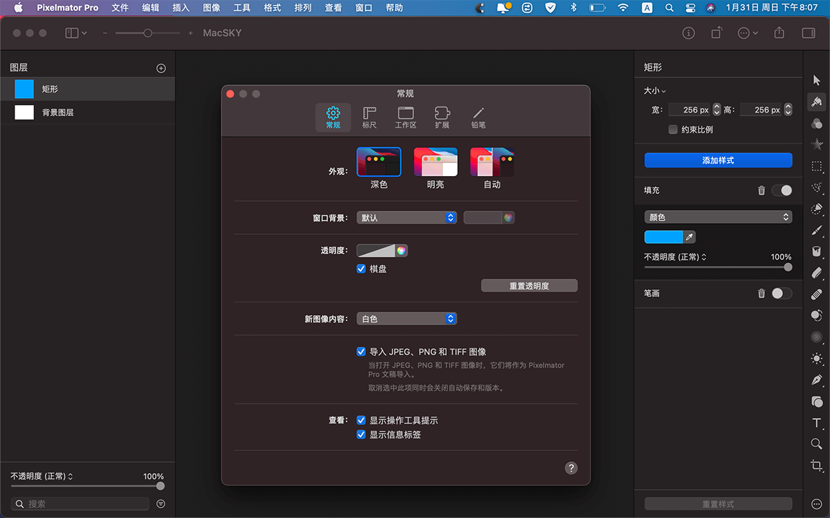 • Pixelmator Pro 提供明暗两种界面,无缝适应 macOS 的浅色及深色模式。